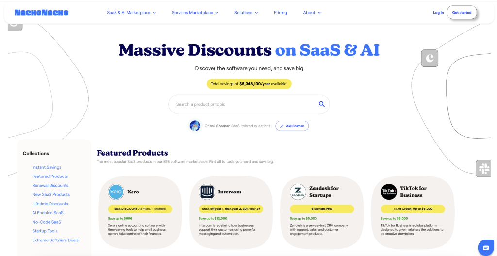 In our B2B software marketplace, we list hundreds of SaaS products in all major categories. All of the products in the marketplace have exclusive discounts, which can only be redeemed through NachoNacho. For example, you could reduce your bill with HubSpot by $18,000/year, ZoomInfo by $7,200/year, or ClickUp by $3,480/year. The total savings available in NachoNacho are $5,251,608/year (as of 12/15/2025).