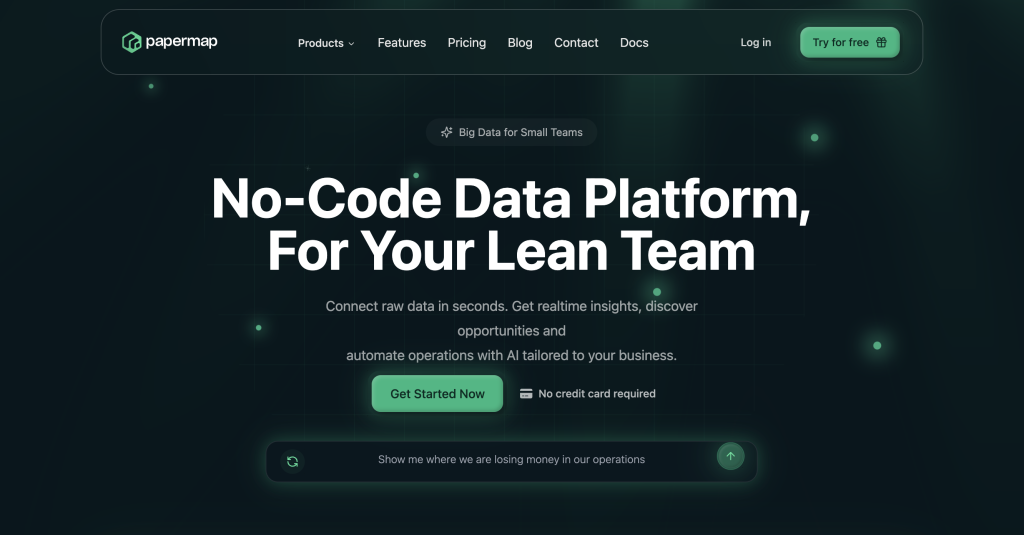 Papermap is an AI-powered data platform that replaces your entire data stack. Ask questions in plain English, get answers in seconds, no SQL or engineering required.