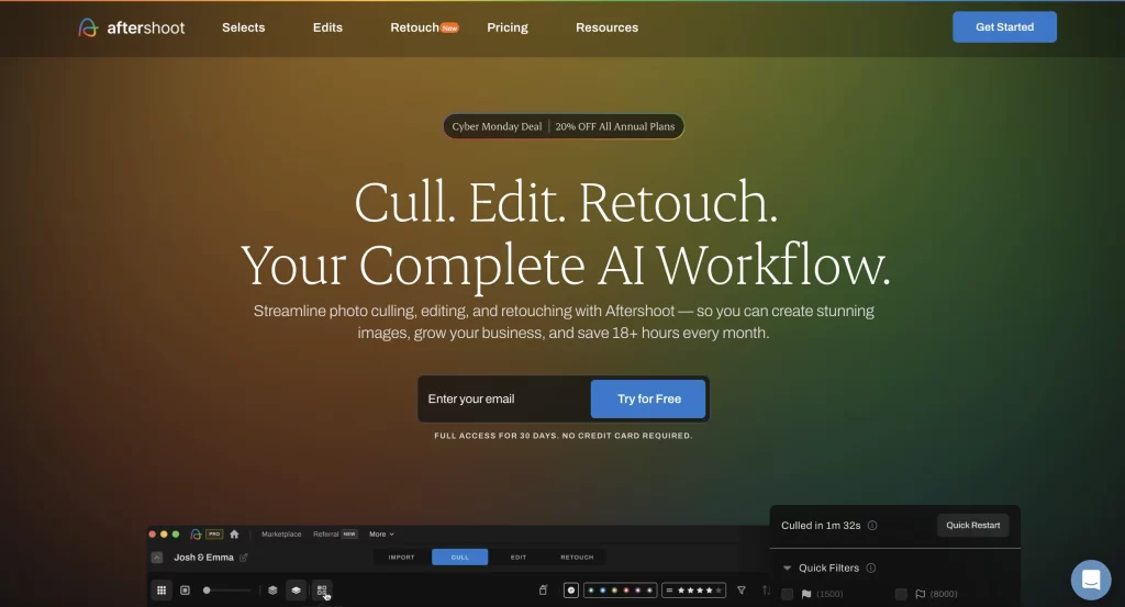 Aftershoot is an AI-powered photo editing assistant that helps photographers save hours by automating culling, editing, and retouching. It intelligently selects your best images by removing duplicates, blinks, and blurry shots, then edits galleries in your personal style using its AI editing engine. Its AI Retouching further polishes portraits by enhancing skin, reducing blemishes, and refining details to create studio-quality results instantly.