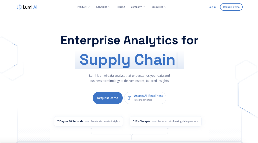 Lumi AI is an AI-driven platform for AI data analytics that helps businesses turn raw operational data into actionable insights across supply chain planning, sales and customer insights, and warehouse operations.